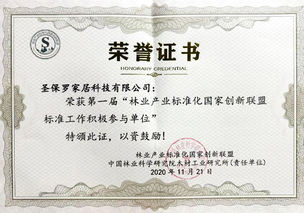 第一屆“林業產業標準化國家創新聯盟標準工作積極參與單位”